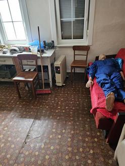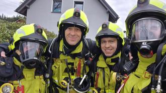 Schnell, nach nur 6 Minuten, rückte der erste Angriffstrupp zur Personensuche und Feuerbekämpfung vor. Einsatzobjekt war ein altes Doppelhaus eines Kameraden, welches zwar unbewohnt war, aber möglichst nicht beschädigt werden sollte. Deshalb wurden die Strahlrohre mit Kabelbinder arretiert um nicht versehentlichen Wasserschaden zu verursachen. Im Gebäude wurden vielerorts elektrische Wärmequellen versteckt, die durch die Einsatztrupps geortet und gemeldet werden mussten. Hier mussten die Wärmebildkameras beider Wehren zum Einsatz kommen und zur Suche verwendet werden. Schon nach kurzer Suche wurde es einem der beiden Angriffstrupp-Kameraden übel und er sackte scheinbar bewusstlos im Obergeschoß zusammen! ATEMSCHUTZ-NOTFALL! Eine gestellte Aufgabe, die aber nur dem "Opfer" bekannt war! Nun war der Atemschutz-Notfalltrupp gefragt, der zum Glück bereitstand. Ausgerüstet mit ihren Atemschutzgeräten und mit Atemschutznebenabgang, der Rettungstasche mit Tragetuch u.v.m. ging es zur Rettung des eigenen Kameraden in das verrauchte Gebäude vor. Schwierig waren dessen Rücktransport über die sehr schmale Treppe, aber letztendlich war der in Not geratene Kamerad in 5 Minuten aus dem Gebäude raus.