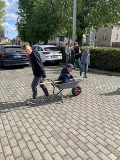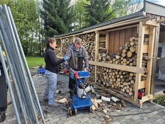 Im Außengelände wuselte es wie im Bienenschwarm! Kameraden reinigten die beiden Einsatzfahrzeuge insbesondere von Innen. Alle Hecken- und Pflanz- und Pflasterbereiche wurden grundhaft vom Fremdbewuchs und vom Unkraut befreit. Dort konnte man auch mal sehen, was unsere Mädels und Jungs der Jugendfeuerwehr so zu leisten im Stande sind. Bei sehr viel Spaß und guter Laune, waren auch Sie beim Unkraut herauskratzen und beim Schubkarrenwettlauf voll dabei! Auf dem Park- und Volleyballplatz stand die Jahrespflege des Ziegelmehlbelages an. Dafür dürfen wir immer das Pflegegerät der Gemeinde Ellefeld nutzen! Das ist große Klasse und locker einen Kasten Bier wert! Um auch in Zukunft unsere Gulaschkanone unter Volldampf stellen zu können, wurde von einigen Kameraden Brennholz geschnitten und gespalten und gleich in die neuen Regale verstaut!