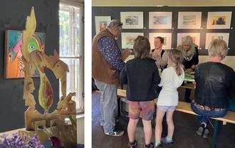 Im Raum luden Plastiken aus Wellpappe und Tische zum Arbeiten mit diesen Materialien zum Selbst-in-Aktion-kommen ein. An jedem der 3 Tage wurde von dem Künstler (links im rechten Bild) eine Mitmachaktion bzw. Mitmachwerkstatt für ca. 1 - 1,5 h für kleine und große Interessierte aller Generationen angeboten.