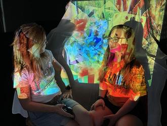 Im Dunkelraum konnte man optisch ein Farbbad nehmen. Ein Beamer präsentierte die Dia-Show mit Bildern und Fotografiken des Künstlers aus den vergangenen Jahren und ganz aktuelle Arbeiten, die wiederum Teil von etwas Neuem werden konnten. Die Person, welche sich in den sich in den (Dunkel)-Raum begabt, wurde Teil des Kunstwerkes. Mit der Kamera wurde dieses Bild aufgenommen. Die entstandenen Fotos erhielten die Mitwirkenden und bei ausdrücklicher Zustimmung der einbezogenen Personen könnten diese auch wieder in die Arbeiten des Künstlers einfließen.