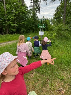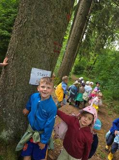 Am Mittwoch, dem 04.06.25 feierten wir im Kindergarten den Kindertag. Wir waren schon alle gespannt, was uns da wohl erwartet. Ein gemeinsames, gesundes Frühstück in den einzelnen Gruppen stärkte uns für den Tag. Dann startete auch schon für alle Käfer- und Igelkinder eine Schnitzeljagd durch unseren schönen Grünbacher Wald. Unterwegs entdeckten wir viele Hinweisbilder mit Waldtieren und Pfeilen.