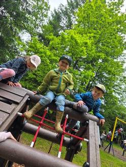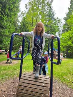 Sie zeigten uns die Richtung, in die wir laufen mussten. Das Ziel war der Waldspielplatz am Schwarzen Stein. Hier konnten wir uns so richtig austoben und ausprobieren. Eigentlich hätten wir gerne noch dort Mittag gegessen, aber der einsetzende Regen machte uns einen Strich durch die Rechnung. Wir beeilten uns auf dem Heimweg und sammelten alle Schilder wieder ein. Am Kindergarten angekommen, machten wir im Turnraum ein Mittagessen-Picknick, als kleine Entschädigung. Wir Igelkinder durften an dem Tag über Mittag aufbleiben, da haben wir uns riesig gefreut.