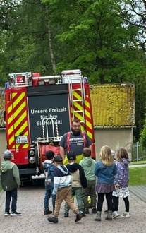 Danach hörte man schon von Weitem das Tatütata der Feuerwehr- und tatsächlich stand sie bereit. Felix nahm uns im großen Feuerwehrauto mit. Hui war das aufregend. Vielen herzlichen Dank!