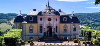 Das Renaissanceschloss, in der Mitte des 16. Jh. zunächst als Gutsherrenhaus errichtet, wurde von Großherzog Carl August zum Sommerquartier umgebaut. Sein Freund und Dichterfürst Goethe wohnte 1828 in der Bergstube und schuf dort stimmungsvolle Gedichte. Sicherlich wurde Goethe auch von den terrassierten Gartenanlagen mit Rosen und Weinreben sowie dem traumhaften Blick auf die Saale zum Dichten inspiriert. Hier kommt man sich vor wie auf einem riesigen Balkon mitten in der zauberhaften Natur.