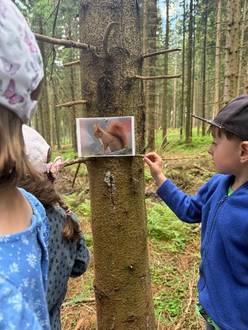 Den Nutzen des Waldes und des Holzes erklärten sie uns kindgerecht. Wir erlauschten Geräusche, entdeckten Spuren, spielten Spiele, bauten ein Eichhörnchenhaus und lösten Rätsel.