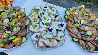 23 Interessierte Wanderfreunde kamen zur geführten Familienwanderung, die in diesem Jahr durch Wanderwegewart Karl-Heinz-Ficker aus Grünbach geführt worden ist. Deren Verpflegungspunkt war die Wanderhütte am "Ruh Dich eweng aus" Was für Liebe die Wanderfreunde in die Organisation stecken, kann man den wunderschön garnierten Pausenbroten am Verpflegungspunkt erkennen. Kein Schnittchen ohne eine essbare Blüte! Wunderschön!
