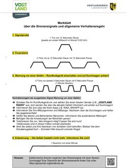 Wie in den vergangenen Jahren bitten wir Sie um erneute Bekanntgabe und Veröffentlichung des Merkblattes zu den Sirenensignalen (siehe beiliegendes Merkblatt Sirenensignale). Auch in diesem Jahr werden wir Ihnen ein Plakat zur Verfügung stellen, um die Bevölkerung für den Warntag zu sensibilisieren. Über unsere Stabstelle Kommunikation wird die Öffentlichkeitsarbeit zum Warntag 2025 vorgenommen. Die Abstimmung mit der Leitstelle Zwickau erfolgt ebenfalls durch uns. Wir werden Sie diesbezüglich auf dem Laufenden halten.