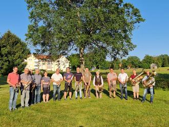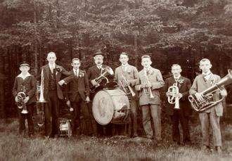 Bruder Ewald Renz kaufte die ersten Instrumente. Auf diesen erlernten Otto Friedel, Kurt John, Kurt Kretzschmann, Max Kretzschmann, Albert Fuchs, Paul Rossnagel, Woldemar Sandner und Walter Lienemann das Musizieren. Der erste öffentliche Auftritt war zum Kinderfest 1923 geplant. Doch bis dahin war viel Übung notwendig. Dank gilt hier Paul Körner und Alfred Schlosser von der örtlichen Blaskapelle, die keine Zeit und Mühe gescheut haben, ihr Können und Wissen dem neuen Chor zu übermitteln. Es wurde Woche für Woche fleißig, ja sogar emsig geübt. In der noch im Bau befindlichen Renzen-Fabrik auf Balken und Asche immer und immer wieder Blasen und Marschieren … bis es klappte. Am Sonntag des Kinderfestes ging es nun zum ersten Mal mit Marschmusik nach Siehdichfür. Doch so einfach war es dann doch nicht! Als es den Gehannesenberg (Siehdichfürer Straße abwärts) runter ging, war es mit Takt und Zusammenhalt vorbei. Obgleich der Schickers Otto die große Trommel schlägt, was seine Kräfte hergeben, es ging schief. Doch Aufgeben?