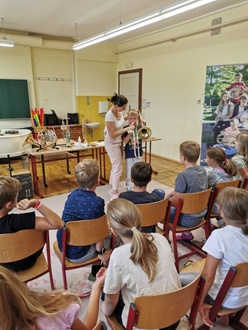 Im Rahmen des Musikunterrichts bekam die Grundschule Grünbach Besuch von Frau Pilz, der ehrenamtlichen Mitarbeiterin des Stadtorchesters Auerbach. Sie gab der Klasse 3 und 4 einen Überblick über die Holz- und Blechblasinstrumente, ordnete diese gemeinsam mit ihnen richtig zu, um anschließend die Kinder aktiv werden zu lassen. Schaffe ich es, einen Ton mit der Trompete zu erzeugen? Wie klingt die Tuba im Vergleich zu einer Posaune? Die Schülerinnen und Schüler freuten sich über die mitgebrachten Instrumente und hatten Spaß beim Ausprobieren.