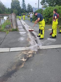 Die notwendige Unterstützung für eine fachgerechte Ölspurbeseitigung kam wie immer von der Spezialfirma zur Ölabwehr. 14 Kameradinnen und Kameraden waren hier im mit zwei Fahrzeugen Einsatz
