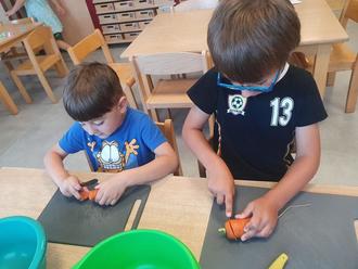 Da so viel Arbeit bekanntlich auch hungrig macht, wollten wir gerne unsere Möhrchen verkosten. Also ging es in die Küche zum Karotten waschen und klein schneiden. Am Ende haben wir sie uns gemeinsam mit den Käferkindern zur Obstpause gut schmecken lassen. Und was wir uns sonst noch so leckeres schmecken lassen, erzählen wir euch beim nächsten Mal.