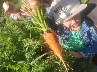 Im August hieß es für uns Igelkinder „Auf die Möhren fertig los". Das lange Warten hatte nun ein Ende, denn in unserem Hochbeet war es Zeit für die Ernte. Endlich waren unsere Möhren, welche wir bereits im Frühjahr gesät hatten, riesengroß und reif für die Ernte. So machten wir uns gemeinsam an die Arbeit und zogen mit ganz viel Kraft die Rübchen an ihrem Kraut aus der Erde heraus. Dabei konnten wir unser Körbchen mit vielen kleinen, aber auch einigen großen Karotten befüllen. Emil hatte dabei besonders viel Glück und zog die größte und längste Möhre aus der Erde. Er wurde somit unser Möhrenkönig.