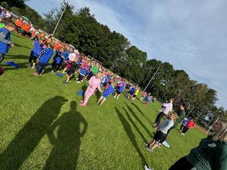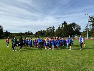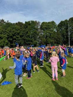 Bereits in der dritten Schulwoche wurde es für unsere Grundschule aufregend, denn wir hatten einen großen Sporttag geplant. Zusammen mit der Grundschule Dorfstadt organisierten wir im Stadion in Falkenstein ein Event, welches viel Freude und Bewegungslust verschaffen sollte. Vielen Dank an alle Eltern, die Fahrgemeinschaften gebildet und somit ermöglicht haben, dass alle Kinder hingefahren und zurückgebracht wurden. Ab 8 Uhr trafen sich alle Kinder, frühstückten gemeinsam und warteten gespannt darauf, bis es losging. Bereits mit dem Aufbau der zum Teil riesigen Luftkissen in Form eines Fußballfeldes, von Basketballkörben, eines Zweifelderballbodens sowie dem Highlight – der Hindernisparcours - wurde schnell klar, dass es sportlich und lustig werden wird. Der Tag stand ganz unter dem Motto „Fairness“, der Wettkampfcharakter sollte diesmal nicht im Mittelpunkt sein. Nachdem es um 12 Uhr noch eine Siegerehrung gab und jeder eine Urkunde bekam, konnten sich die Kinder mit Wiener und Brötchen stärken. Am liebsten sprangen und rannten die Kinder durch den Hindernisparcours, aber auch die vielen anderen Stationen machten den 83 Schüler/innen Spaß. Der nächste sportliche Höhepunkt kommt bestimmt, bis dahin heißt es fleißig weiter lernen und „sportfrei“.