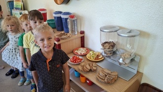 Im August war etwas neu - es gibt jetzt jeden Tag ein gesundes Frühstück im Kindergarten. Dieses wird frisch zubereitet und sehr abwechslungsreich gestaltet. Montag und Freitag ist immer Müslitag, Dienstag bis Donnerstag gibt es im Wechsel Brot, Semmel, Knäckebrot oder Filinchen mit verschiedenen Belägen sowie Joghurt, Quark und Eiern. Obst und Gemüse steht täglich für alle bereit. Es ist für uns ganz toll unser Frühstück selbst zuzubereiten und in gemütlicher Runde zu verzehren. Wir fühlen uns ein bisschen wie im Hotel.