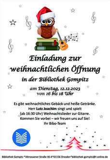 Die ehrenamtlichen Mitarbeiterinnen der Bibliothek Gompitz wünschen Ihnen allen eine schöne Advents- und Weihnachtszeit, bleiben oder werden Sie gesund und auf ein Wiedersehen im neuen Jahr.