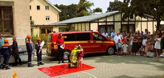 Ein ganz besonderes Highlight war der Besuch der Freiwilligen Feuerwehr Mobschatz, die erst mit einem Anhänger, beladen mit Zuckertüten, und dann mit einem großen Löschfahrzeug auf den Schulhof rollte. Dies sorgte für leuchtende Kinderaugen. Die Feuerwehrleute der Freiwilligen Feuerwehr und der Jugendfeuerwehr erlaubten sich zunächst einen kleinen Scherz mit den aufgeregten Schulanfängern, denn der Schlüssel für den Anhänger mit den Zuckertüten war verschwunden. Kurzerhand musste mit schwerem Gerät das Schloss ‚geknackt‘ werden. Alle Kinder waren begeistert von dieser humorvollen Showeinlage. Nun konnte es endlich losgehen und die Kinder und Jugendlichen der Freiwilligen Jugendfeuerwehr Mobschatz konnten die bunten und prall gefüllten Zuckertüten an die Schulanfänger der Fuchs- und Bärenklasse übergeben. „Ein tolles Erlebnis – unvergesslich! Das habt ihr schön gemacht!“, lobte ein Opa die bunte Feier. Nach vielen Fotos verließen alle Schulanfänger mit ihren Familien den Schulhof – im Gepäck nicht nur die großen Zuckertüten, sondern auch viel Freude, Spaß und schöne Erinnerungen.