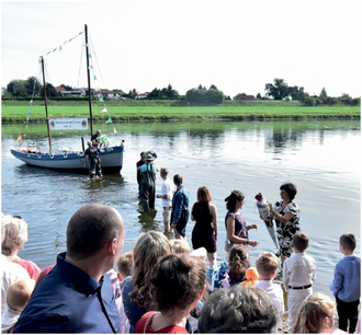 Ein besonderes Highlight war die Zuckertüten-Übergabe. Alle staunten mit großen Augen als ein Boot der Marinekameradschaft Dresden 1896 e.V. flussaufwärts gesegelt kam und am Elbufer den Anker warf. Riesig war die Freude bei den Kids als mit Hilfe einer Menschenkette für jeden Erstklässler die Schultüte über das Wasser gereicht wurde.