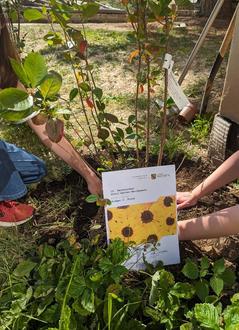 Schüler und Schülerinnen pflanzen gemeinsam die Aronia ein.