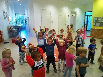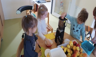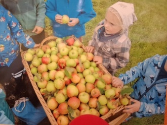 Besonders der Apfel zog uns in seinen Bann. Wir stapften zur Streuobstwiese und füllten dort einen großen Korb mit leckeren Äpfeln. Zurück im Kindergarten schauten wir auf unsere Ernte: Jeder Apfel hatte eine eigene Geschichte – mal saftig und süß, mal spritzig sauer; groß oder klein, gelb, rot oder grün.