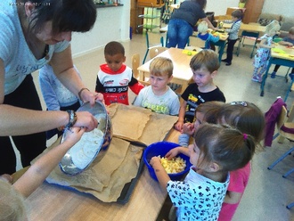 Und was wir daraus alles schufen: Wir druckten, bastelten, wiegten, legten Buchstaben, buken Kuchen, pressten Saft, kochten Kompott und zauberten Schokoäpfel, die glitzerten wie kleine Wunder. Außerdem hörten wir Apfelgeschichten und sangen viele Lieder rund um den Apfel.