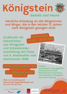 - 15.03. 15 Uhr Erzählcafé mit Ausstellungseröffnung. Lauschen Sie interessanten Geschichten aus Königstein und kommen Sie bei Kaffee und Kuchen mit anderen Königsteinern ins Gespräch. Ganz besonders sind alle Bürgerinnen und Bürger eingeladen, die in den letzten 12 Jahren nach Königstein gezogen sind. Die Ausstellung zeigt Fotografien aus dem Königstein der 80er Jahre. Den musikalischen Auftakt gestaltet das Sandstein-Duo. Anmeldung bei Juliane Dietrich, julianedietrich@weltbewusst.net, Tel. 01776090254