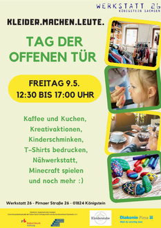 | - | 09.05. 12:30-17 Uhr Tag der Offenen Tür. Kaffee und Kuchen, Kreativaktionen, Kinderschminken, T-Shirts bedrucken, Nähwerkstatt, Minecraft spielen und noch mehr |