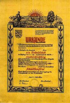 Unabhängig von diesen Schwierigkeiten wurde der Prozess der Enteignung von Bülows unbeirrt fortgesetzt. So konnte schließlich ein Reporter der Volks-Zeitung am 25. Oktober von einer Veranstaltung berichten, bei der sich „sonntäglich“ gekleidete Menschen auf den Dorfstraßen in Richtung des Gutes bewegten. Hunderte sollen sich versammelt haben, „während sich auf den Terrassen die Bodenkommission und die Vertreter der Parteien und Behörden zusammenfanden.“ Natürlich - so im Bericht - ließ es sich der Bürgermeister nicht nehmen, „von der große(n) Bedeutung der Stunde“ zu sprechen. Und der anwesende Landrat rechnete noch einmal „mit dem Junkertum, dem Hort der Reaktion und der Clique der Kriegsverbrecher“ ab. Anschließend übergab er „jedem einzelnen Bewerber, durch Handschlag bekräftigt, die Urkunde“ über die Bodenreform. (06)