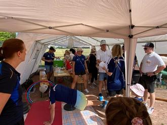 Eröffnet wurde das Fest planmäßig um 10.00 Uhr. Dies war der Startschuss für den sportlichen Wettstreit der Familien unserer Gemeinde und dem Umland in den Disziplinen: Torwandschießen, Gummistiefelweitwurf, Seilspringen, Hindernis- und Eierlauf, Sackhüpfen, Sommer-Ski-Lauf, Dart und Wissensquiz der sechs Sektionen unseres Sportvereins. Des Weiteren wurden an der Station Gymnastik auch sportliche Übungen ausgeübt wie Hula-Hoop,Liegestütze oder Situps. Unterstützt wurden wir wieder durch die FFW Gröbers, die auch eine Station stellte - Danke für Eure Bereicherung unseres Familiensportfestes!