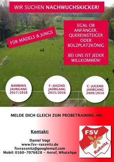 Für die kommende Saison suchen wir Spieler und Spielerinnen für die Bambinis, F- und C-Junioren. Sollte ihr Interesse haben, meldet euch einfach bei uns. Die Kontaktdaten sind auf dem Flyer zu finden oder ihr schreibt eine Mail an: fsvrassnitz@googlemail.com.