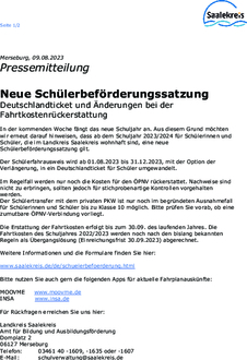 In der kommenden Woche fängt das neue Schuljahr an. Aus diesem Grund möchten wir erneut darauf hinweisen, dass ab dem Schuljahr 2023/2024 für Schülerinnen und Schüler, die im Landkreis Saalekreis wohnhaft sind, eine neue Schülerbeförderungssatzung gilt.