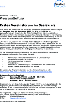 Zum ersten Mal veranstaltet der Saalekreis gemeinsam mit der Stadt Wettin-Löbejün am Samstag, dem 30. September 2023 von 9:30 – 15:00 Uhr ein Vereinsforum, um Engagierten die Möglichkeit zu bieten, sich in verschiedenen Themenbereichen weiterzubilden, sich auszutauschen und mit anderen Freiwilligen zu vernetzen. Denn neben aktiven Mitgliedern und helfenden Händen benötigt es für ein erfolgreiches Vereinsleben auch Wissen und kompetente Partnerinnen und Partner.