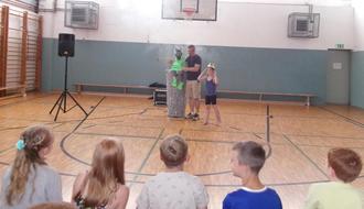 Als Nächstes hatten wir Besuch von der „Mobilen Mitmachbühne“. Dieses Mal sahen wir das Märchen vom Froschkönig in einer sehr lustigen Variante. Zunächst wurden die Kenntnisse der Kinder zu diesem Märchen zusammen getragen, bevor der „Froschkönig“ aufgeführt wurde. Hier wurden alle Kinder mit einbezogen und mittels einer Bauchrednershow war diese Veranstaltung für alle Kinder sehr lustig.