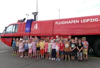 Bevor wir alle in unsere langersehnten und wohlverdienten Betriebsferien starteten, führte uns das nächste Ferienhighlight zur Flughafentour. Voller Vorfreude und Spannung wurden wir dafür mit einem Reisebus vom Hort abgeholt. Am Besucherschalter begrüßte uns eine nette Flughafenmitarbeiterin namens Anika. Zunächst erhielten wir alle einen Besucherausweis, welcher an unserer Kleidung angezwickt wurde, damit wir auch als Besucher erkenntlich waren. Frau Anika führte uns über die Terminals bis hin zum Sicherheitscheck. Dort war es sehr aufregend, denn unsere Rucksäcke und auch jeder selbst wurde durchleuchtet. Weiter ging es mit einem Bus über das Rollfeld. Dort sahen wir, wie gerade ein Flugzeug von seiner Parkposition hinausgeschleppt wurde. Kurze Zeit später sahen wir auch noch dessen Start. Auch die technischen Fahrzeuge waren sehr interessant. Eine Runde um die Antonov`s, die Riesen unter den Flugzeugen, brachte so manchen „Hortstrolch“ zum Staunen! Zum Schluss unserer Busfahrt ging es noch zur Flughafenfeuerwehr. Das große Löschfahrzeug namens „Panther“ wurde extra für uns herausgefahren. Alles wurde von Anika genau erklärt. Wir sahen auch noch ein großes Fahrzeug namens „Elefant“ und erfuhren, dass dieses große Auto im Winter für die Enteisung der Flugzeuge und deren Tragflächen sorgt. Viele Fragen der Kinder rund um den Flughafen wurden beantwortet. Nach einer kleinen Stärkung ging es mit unserem Reisebus wieder in Richtung Gröbers.