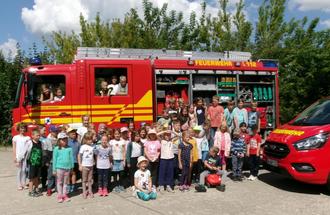 Ein weiterer Höhepunkt war unser traditioneller Besuch bei der Feuerwehr Gröbers. Gleich zu Beginn ging die Sirene los und die Feuerwehr musste ausrücken. Kurz darauf wurden wir von den Feuerwehrfrauen herzlich begrüßt und in Gruppen eingeteilt. Es gab viele kleine Spiele und Stationen zum Mitmachen und verschiedene Materialien zum Anschauen. Auf dem Schulhof fanden Wasserspiele statt. Bei der 1. Station mussten wir einen Ball im Slalomlauf um die Kegel rollen. Bei der 2. Station hatten wir einen großen Schlauch und mussten damit versuchen, das Wasser durch ein Loch zu spritzen. Hinter dem Loch befand sich ein Behälter, der sich daraufhin mit Wasser füllte. War genügend Wasser drinnen, ging eine Klappe hoch und die Aufgabe war erfüllt. Ein großes Feuerwehrauto haben wir uns auch angesehen und alles wurde ausführlich erklärt. Weitere Stationen im Gerätehaus waren: Bobycar rennen, Anprobieren der großen Brandschutzsachen und das Spiel „Finde unser Maskottchen Honk!“. Mit einer Augenbinde, welche eine Rauchsituation symbolisieren sollte, und einem Feuerwehrhelm auf dem Kopf suchte jedes Kind den versteckten „Honk“ in kriechender Position.