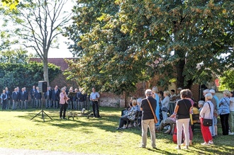 am 16. September konnte die über drei Jahre gehende Umgestaltung des Friedhofs Dieskau mit einer kleinen Feier abgeschlossen werden. Am künftigen Standort des Kunstwerks „Ein Jegliches hat seine Zeit“ nahmen etwa 60 Teilnehmer teil, als der Männerchor Zwintschöna bei „Kaiserwetter“ die Veranstaltung mit dem Lied „Am Brunnen vor dem Tore“ eröffnete.