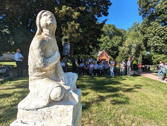 Die anschließende Enthüllung eines Gipsmodells des neuen Kunstwerks wurde mit viel Beifall bedacht. Herr Dieter Friesecke würdigte in seinem kurzen Schlusswort die gelungene Arbeit unseres Zwintschönaer Steinbildhauers Ulrich Janku, mit der in Bälde auf dem Friedhof Dieskau ein weiteres schönes Kunstwerk stehen wird.