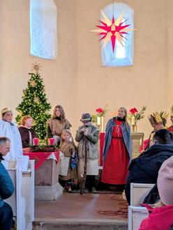 Der Pfarrer begrüßte um 14 Uhr die vielen Besucher, junge und alte, große und kleine. Die Kirche war sehr gut besucht, aber jeder bekam einen Platz. Herr Schönheit begleitete die Sängerinnen und Sänger auf der Orgel. Frau Dargel spielte auf der Bratsche. Sie unterstützte die Kinder musikalisch, als sie die Weihnachtsgeschichte vorspielten. Sie hatten wie immer hübsche Kostüme geschneidert. Es ist jedes mal schön, den Kindern dabei zuzusehen. Frau Lüdtke verteilte kleine Geschenke an sie. Das war der Lohn für ihre sehr schöne Aufführung.