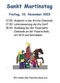 Martinstag: Dieses Jahr wollen wir den Umzug bei der Feuerwehr ausklingen lassen. Die Vereinsmitglieder legen Würstchen und Steaks auf den Grill und bieten kalte und warme Getränke an. Also stecken Sie Geld ein! Die Einnahmen und Spenden sind für den Förderverein FFw Osmünde, einem guten Zweck.
