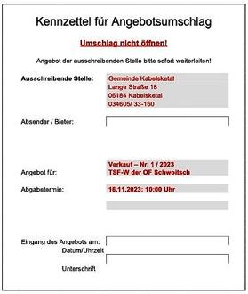 | 2. | Schriftliche Angebote sind in einem geschlossenen Umschlag an die Gemeinde Kabelsketal zu schicken. Auf dem Umschlag, der Ihr Angebot oder Ihren Teilnahmeantrag enthält, kleben Sie bitte kenntlich den Angebotskennzettel und notieren Sie die Adresse Ihres Unternehmens/ juristische Person oder den vollständigen Namen einer natürlichen Person. | |