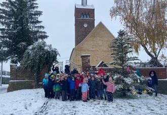 Alle Jahre wieder kommt der Kindergarten der Kita „Villa Kunterbunt“ Großkugel und schmückt unsere Tanne vor der Kirche mit selbst gebasteltem Schmuck.