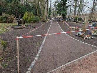 Als letzte Maßnahme auf dem Friedhofsgelände wurde schließlich der schon lange vorgeschlagene Schrägweg zu den Urnen-Grabfeldern von der Firma „NaturPur“ realisiert. Gleichzeitig erfolgten durch sie auch einige nötige Terrain-Planierungen.