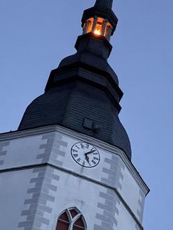 Danach war schon klar, nichts wird es mit 1,30 m großen Stern da oben und die erste Enttäuschung war deutlich zu spüren. Selbst die nächstkleinere Größe, die in der Oberlausitz hergestellt wird, stellte die Beteiligten vor eine große Herausforderung, aber man war sich einig, eine noch kleinere Variante kommt nicht in Frage. Wie bekommt man das Teil auf den Turm, ohne es in luftiger Höhe zusammenzubauen und wie erfolgt die Befestigung zwischen den Säulen, dass waren die nächsten Schwerpunkte für das Team. Auch Kontakte zu anderen Gemeinden, wo schon Sterne leuchten, brachten keinen konkreten Aufschluss, denn zu speziell sind die Bedingungen in Großthiemig vor allem im Turminneren. Nach wochenlanger Grübelei hatte man dann endlich eine umsetzbare Idee herausgefunden. In ein Drahtkorsett sollte der Stern gelegt werden, welches an Drahtseilen zwischen den Säulen befestigt wird. Die Vorbereitungen für die Montage liefen nun auf Hochtouren, denn schließlich wollte man nicht erst zur kalten Jahreszeit damit beginnen. Am Kirmessamstag sollte dann der große Tag werden, wo die Installation stattfinden sollte, aber schnell wurde klar, dass bei den vorherrschenden Windbedingungen nichts geht und die Aktion musste abgebrochen werden, denn die Sicherheit aller Beteiligten stand im Vordergrund. Am Reformationstag war nun der nächste Anlauf geplant und endlich meinte es auch das Wetter gut, kein Wind und Sonnenschein sorgten sogar für optimale Bedingungen. Pünktlich 14.00 Uhr startete die Mission Sternmontage, als Hilfe wurde noch der erfahrene Dachdecker Uwe Matthäus aus dem benachbarten Brößnitz hinzugeholt. Sogar eine Checkliste für benötigtes Werkzeug wurde vorher erstellt, damit alles perfekt und reibungslos stattfinden kann. Naja, ganz perfekt ging es dann doch nicht über die Bühne, denn eine falsche Schlüsselgröße sorgte für etwas Verzögerung. Der halb vorgefertigte Stern musste nun in luftiger Höhe noch zusammengebaut und befestigt werden. Auch die elektrische Verkabelung musste geändert werden, damit der Anschluss durch die bestehende Luke geführt werden konnte. Die größte Schwierigkeit bestand jedoch, die beengten Bedingungen zu meistern, denn zwei Helfer zwischen den Säulen und drei auf den innliegenden Leitern wurde benötigt, um das Material und Werkzeug an Ort und Stelle zu bringen. Nach knapp zwei Stunden Montagezeit hieß es dann Mission erfüllt und alle Mann „Absitzen“. Deutlich spürbar war dann die Erleichterung bei der Vorsitzenden Martina Opitz, als alle fünf Beteiligten heile Vollzug über das erfolgreiche Projekt melden konnten. Als dann mit eintretender Dunkelheit der Stern zum Probelauf das erste Mal über den Dächern von Großthiemig strahlte, herrschte nicht nur bei den Machern große Freude auch in den Netzwerken waren sofort Bilder und Danksagungen unterwegs.
