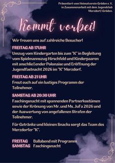 Wir freuen uns sehr über die zahlreichen Anmeldungen der Merzdorfer und Grödner Jugend und hoffen auf ein unvergessliches Wochenende. Eröffnet wird die Fastnacht am Freitag, dem 20.02.2026 mit einem großen Ballabend. Nach dem festlichen Einmarsch aller Paare gegen 17.00 Uhr, findet am Abend ab 20.30 Uhr das Programm unserer Fastnachtsgruppe statt. Wir freuen uns auf zahlreiche Besucher!