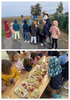 Gesund und spannend ging es bei einem Besuch des Obsthof Ibisch, gefördert vom Landesschulobstprogramm, weiter. Einmal im Jahr werden die Erstklässler der Schule über die Felder der Firma Ibisch geführt. Sie lernten, welches Obst und Gemüse wo angebaut wird, wie man über den Sommer richtig bewässert, welche Besonderheiten bei der Ernte zu berücksichtigen sind und wie die geernteten Früchte letztlich richtig gelagert werden. Zahlreiche Sorten von Äpfeln über Kartoffeln, Kohl bis hin zu Fenchel und Romanesco galt es zu entdecken. Eine Kostprobe der Äpfel durfte da natürlich nicht fehlen. Für den Koch- und Back-Tag in der Schule wurden einige Stiegen mit Äpfeln mit auf den Weg gegeben.