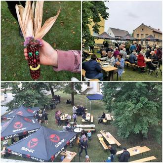 Das Fest begann um 14 Uhr mit einem Gottesdienst. Der Heimatverein öffnete um 15 Uhr seine Räume. Gemeinsam wurde auf dem Kirchhof, mit seinem einzigartigen Ambiente, gefeiert. Bei Kaffee, Kuchen, Flammkuchen mit Grödener Federweisen sowie Bratwurst vom Grill ließen es sich Alle gut gehen. Eine Bastelstraße lud unsere kleinen und großen Gäste ein, mit Zierkürbissen, Kastanien, Mais und anderen Naturmaterialien zu basteln. Dabei entstanden kleine lustige Kunstwerke.