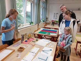 Während sich die Erwachsenen auch bei Schulleiterin Andrea Ackermann im Elternforum ausführlich über die Lernprinzipien der Grundschule informieren konnten, lockte der Duft von frischem Popcorn aus einer Popcornmaschine die Kinder von Raum zu Raum. Die Klassenräume luden nämlich nicht nur zu Malerei und Bastelarbeiten ein. Erzieherin Sarah Anger präsentierte ihre Materialien zum Unterrichtsfach „Gesunde Ernährung“, erklärte die Ernährungspyramide und wieviel Zucker die unterschiedlichen Lebensmittel enthalten. Passend dazu konnten selbstgebackenes Brot und in der Schulküche gebackene Blumenkohl-Pizza verkostet werden. In einem anderen Raum begeisterte Lehrerin Linda Schwarzenberger die Kinder mit einem schwarzen Tuch, jeder Menge Glitzer und der Geschichte über die Entstehung des Universums. Außerdem stellte sie ein Lernbüro vor, welches ihre Erstklässler nutzen dürfen, um konzentrierter und ohne Ablenkung lernen zu können. Die Erwachsenen konnten derweil die Gelegenheit nutzen und sich bei einer entspannten Tasse Kaffee und einem Stück Kuchen mit Lehrern und anderen Eltern austauschen. Das Interesse an dieser kleinen aber besonderen Schule ist groß, dementsprechend gab es viel zu erzählen.