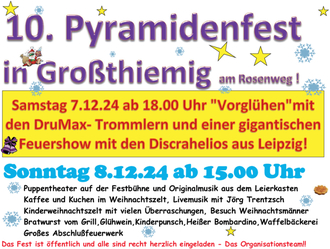Für den Schlußpunkt ist ein großes Feuerwerk geplant, welches dann auch das endgültigen Ende dieser lieb gewonnen Tradition besiegelt. Mit einem lachenden und einem weinenden Auge wird dann eine 10-jährige Ära zu Ende gehen, wobei alle Helfer und Unterstützer sich noch einmal freuen würden, soviel wie möglich Besucher begrüßen zu dürfen, um auch persönlich Danke zu sagen. Vielleicht sieht man sich dann im nächsten Jahr bei einem Türchen im lebenden Adventskalender in kleinerer Runde wieder, denn ganz will sich das Pyramidenfestteam vom Rosenweg mit seinen Helfern nicht aus dem Großthiemiger Veranstaltungskalender zurückziehen.