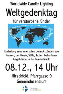 Am 08.12.2024, 14 Uhr in das Gemeindezentrum Hirschfeld, Pfarrgasse 9 sind Sie, liebe Angehörige, herzlich eingeladen zum individuellen und gemeinschaftlichen Innehalten beim Anzünden von Kerzen, bei Musik, Stille, Texten betroffener Eltern und der Möglichkeit des Gesprächs bei heißem Getränk.