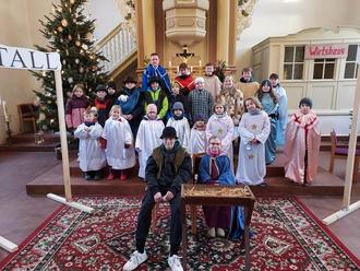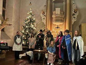 Am späten Abend folgte die feierliche Christvesper, die von den Konfirmanden und erwachsenen Gemeindemitgliedern gestaltet wurde. Dieses Krippenspiel brachte die Weihnachtsgeschichte in einem anderen Licht auf die Bühne: Neben den vertrauten Szenen von Maria, Josef und den Hirten standen hier die Sterndeuter und König Herodes im Mittelpunkt.
