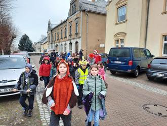 In der Woche vor den Winterferien wurde in Großthiemig wieder fleißig gezampert. Wie jedes Jahr wanderten Schüler, Erzieher und Eltern der Evangelischen Schraden Grundschule als lustige Gesellen verkleidet durch die Straßen von Großthiemig und erheischten von den freundlichen Dorfbewohnern Süßigkeiten und Geld für die Klassenkasse.